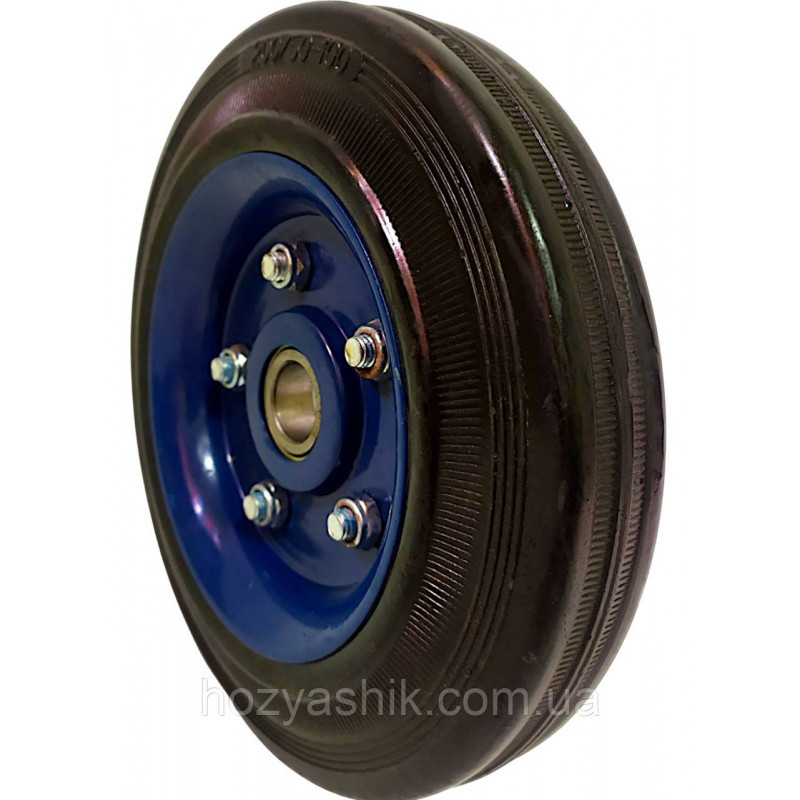 Колесо на стандартній чорній гумі модель 400200 діаметром 200 мм одне з найпоширеніших у використанні на ринку України. Складається зі сталевого оцинкованого диска, литої еластичної гумової шини чорного кольору, що не потребує обслуговування кулькового підшипника, який відповідає за легкість і плавність ходу.