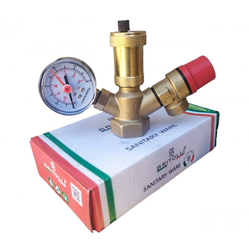 Склад виробу: запобіжний клапан, автоматичний повітровідвідник, манометр, латунний корпус.