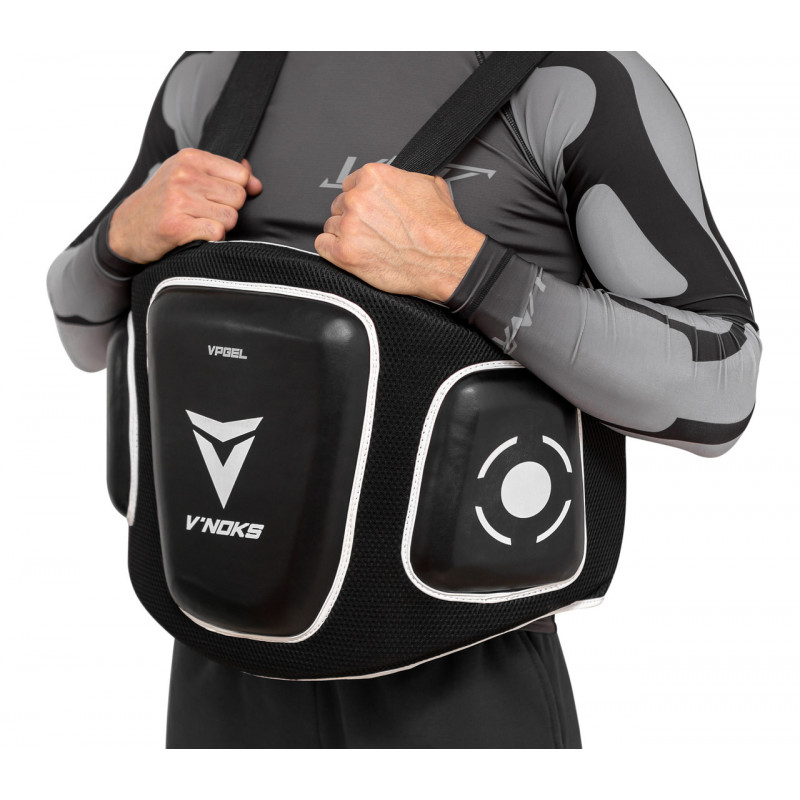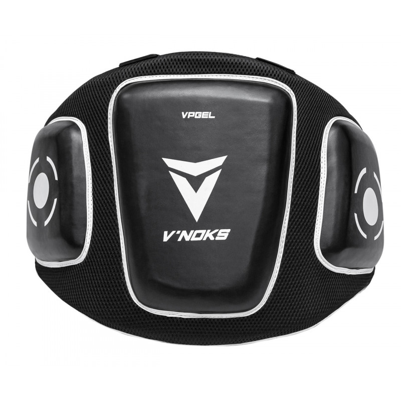 Пояс тренера V`Noks Aria White забезпечує надійний захист від ударів області живота та грудей тренера. Багатошаровий наповнювач поглинає енергію удару, не завдаючи шкоди обом партнерам. Зовні захист виготовлений із міцного синтетичного матеріалу у вигляді 3D сітки (для кращої вентиляції та комфорту тренера), усередині – абсорбуючий підклад. Зовнішні додаткові подушки виконані із міцної синтетичної шкіри. Усі матеріали відрізняються підвищеною зносостійкістю. Фіксується пояс тренера за допомогою ременів на талії та плечах. Розмір – універсальний.